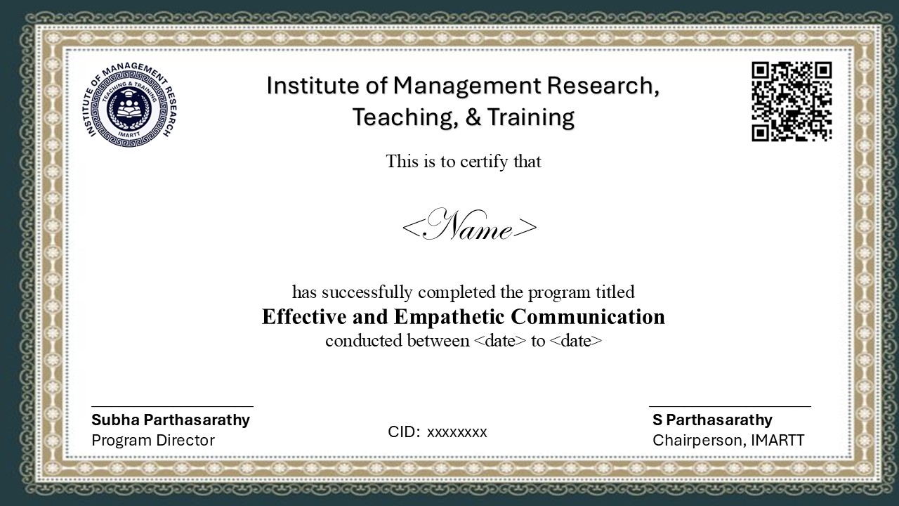 Develop empathetic and mindful communication skills by understanding underlying needs, expressing oneself clearly and compassionately, managing difficult conversations with care, and applying these skills in both personal and professional settings. The pedagogy will be experiential with discussions, activities (individual and group), role plays, mindfulness, and meditative practices backed by frameworks and concepts that will further strengthen the learning.