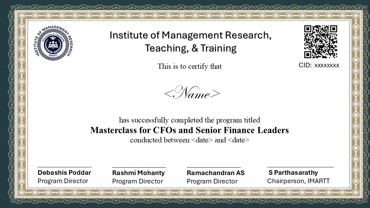 The Masterclass integrates M&A and portfolio decisions, strategic financial planning, treasury and liquidity management, enterprise risk, and ESG-linked value creation equipping finance leaders to act as trusted advisors to CEOs, boards, investors, and regulators. The emphasis is on judgment, trade-offs, and executive influence, not tools alone.