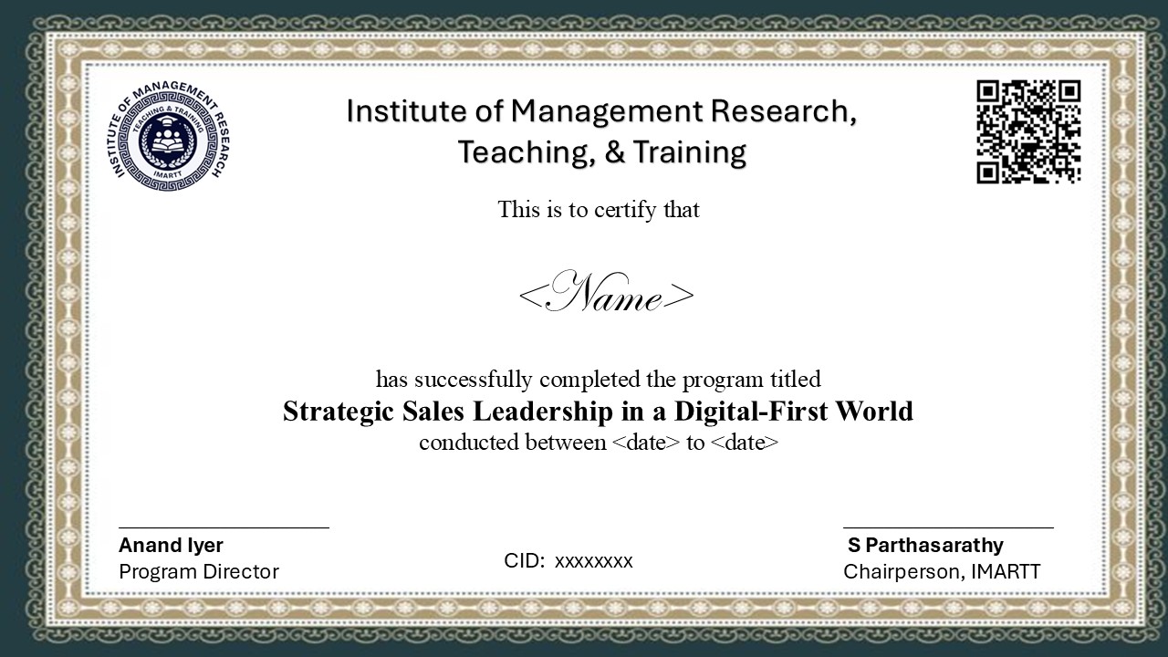 The Strategic Sales Leadership in a Digital-First World program is specifically designed to empower mid-senior level sales managers with the strategic mindset, leadership capabilities, and practical tools needed to lead high-performing sales teams in a customer-centric, data-driven, and digitally enabled world.